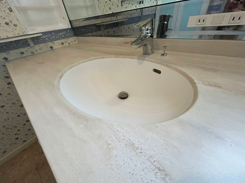 お客様のご要望が現在の洗面カウンターがボウルと天板に継ぎ目があり汚れが溜まりやすくまた清掃性も悪いとのことで、天板部分のみオーダーで取り替えました。